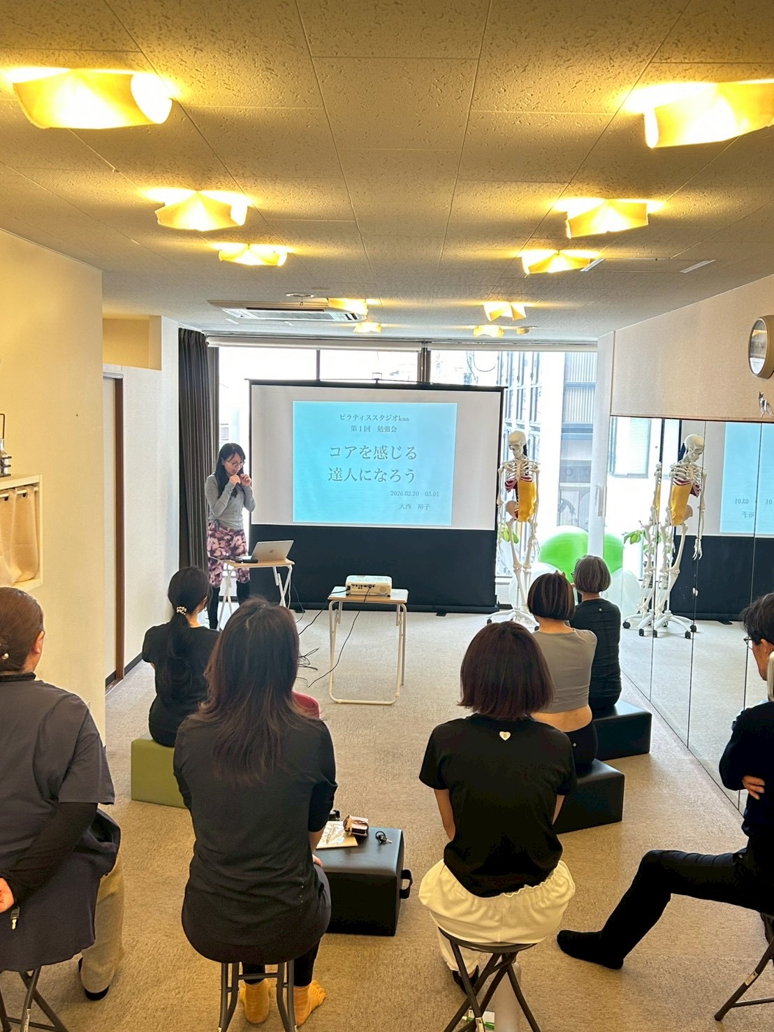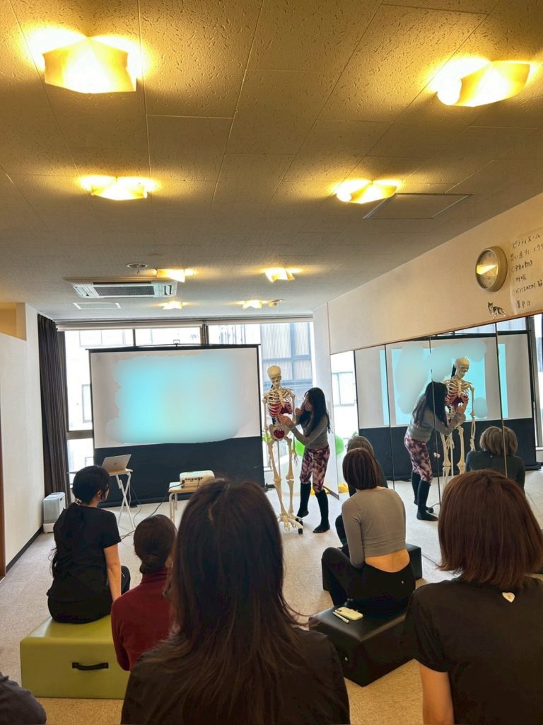 前半はスライドやkuaの看板(笑)骨格模型流星くんを使って、コアに関係する筋肉や美しい姿勢や動作に関係する筋肉群の相関関係などをお話をし、